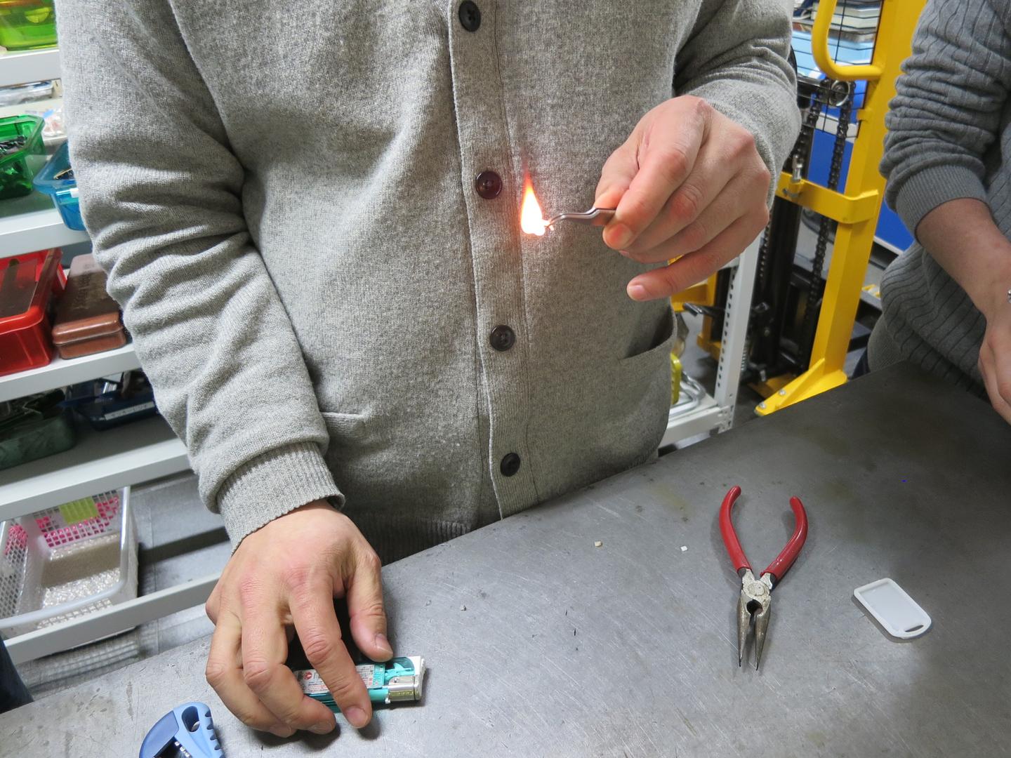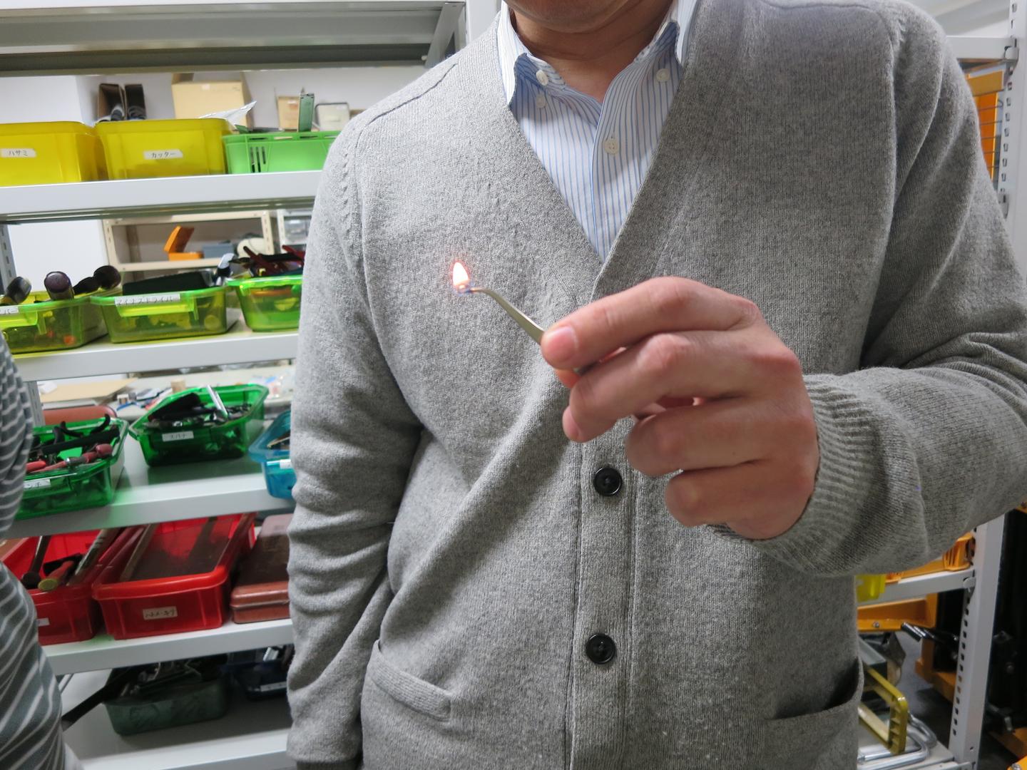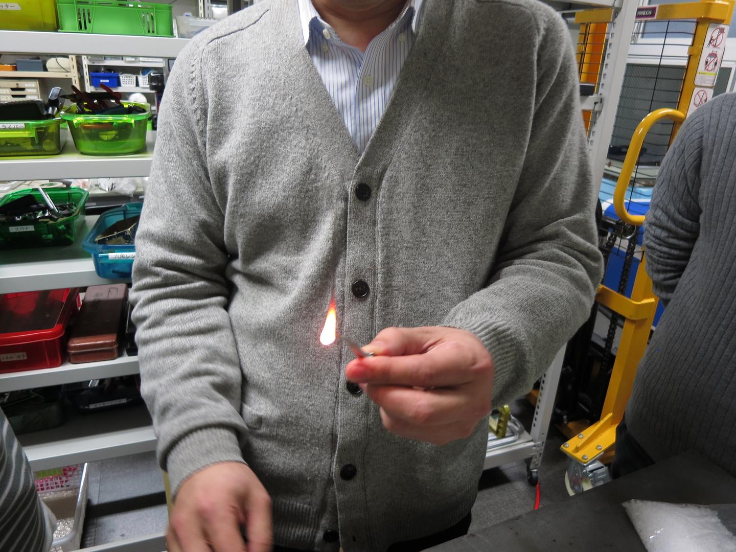 なるほど!違いがわかったところで、実際に製品を小さく切り出し燃やしてみる。